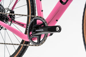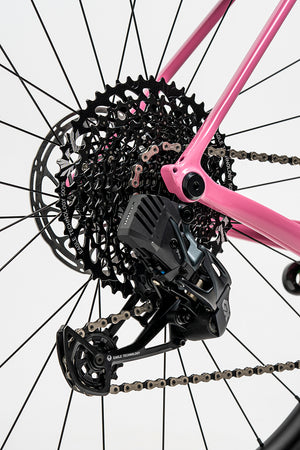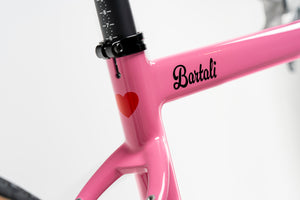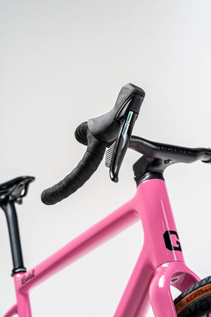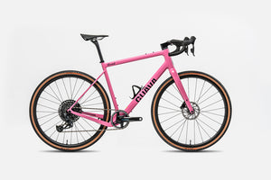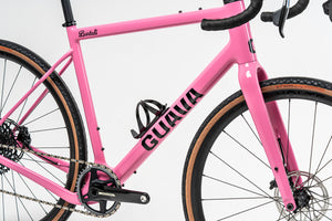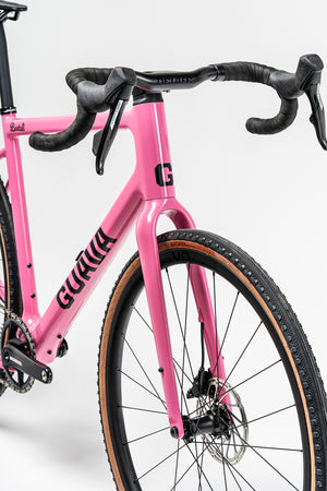 Esta Freedom Machine es muy especial. Tiene un marco Guava Spot de fibra de carbono, con componentes y detalles personalizados, ruedas gravel de carbono Volte y neumáticos WTB Biway para superficies mixtas. Pero no es especial por todo eso. Es especial porque es una edición limitada de color rosa, como el maillot de líder del Giro: Gino Bartali, la leyenda italiana que salvó cientos de vidas durante la guerra ocultando documentos falsificados dentro de los tubos de su bici.